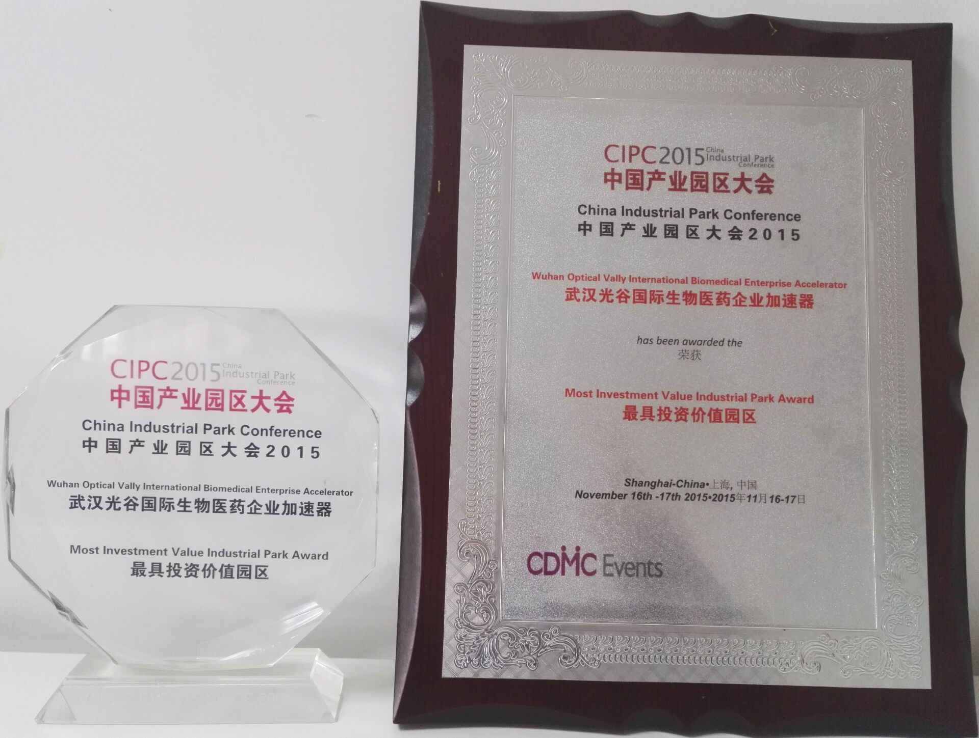 2015中國產業園區大會“最具投資價值園區”獎(光谷生物醫藥加速器)