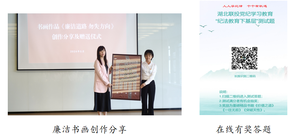 ???以案說紀一堂課、以物喻廉一幅畫、寓教于樂一支歌、抒懷詠志一首詩、警示寄語一句話、法規測試一張卷,紀法宣傳有聲有色,廉潔教育有滋有味。5月6日,湖北聯投黨紀學習教育·“紀法教育下基層”活動在東湖高新園區運營板塊長沙區域公司舉行,以廣大黨員干部員工喜聞樂見的形式將“紀法套餐”送到基層一線。湖北聯投紀委副書記、黨委巡察辦主任張敏容出席活動并作專題黨課,湖北聯投紀委副書記胡志偉出席活動。